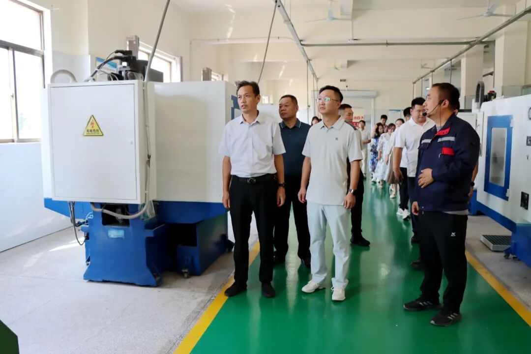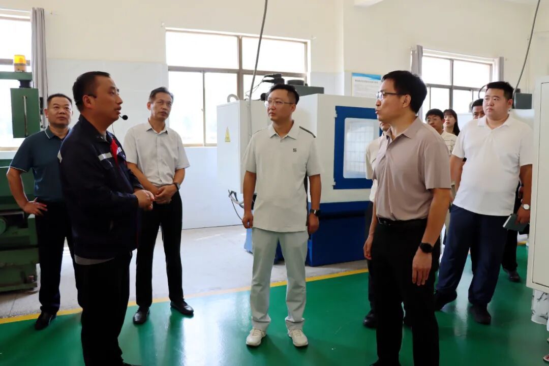 考察团首站走进泽东楼机电一体化专业实训中心,该中心是学校重点建设的示范性实训基地,承担着机电一体化技术、无人机应用技术等专业的实训教学任务。机电工程系主任朱燕首先向考察团介绍了专业建设规划、课程体系设置及人才培养目标,随后由实训中心主任杨飞带领参观实训车间。杨主任结合现场实训场景,详细讲解了实训室的设备配置标准 —— 中心配备有数控车床、数控铣床、加工中心等实训设备,可同时满足120名学生开展理实一体化教学。在参观过程中,考察团成员不时驻足询问、交流实训教学安排、技能考核标准及学生就业方向,杨主任作了详细解答,谷桂林副局长等领导对于实训实践工作给予充分肯定。