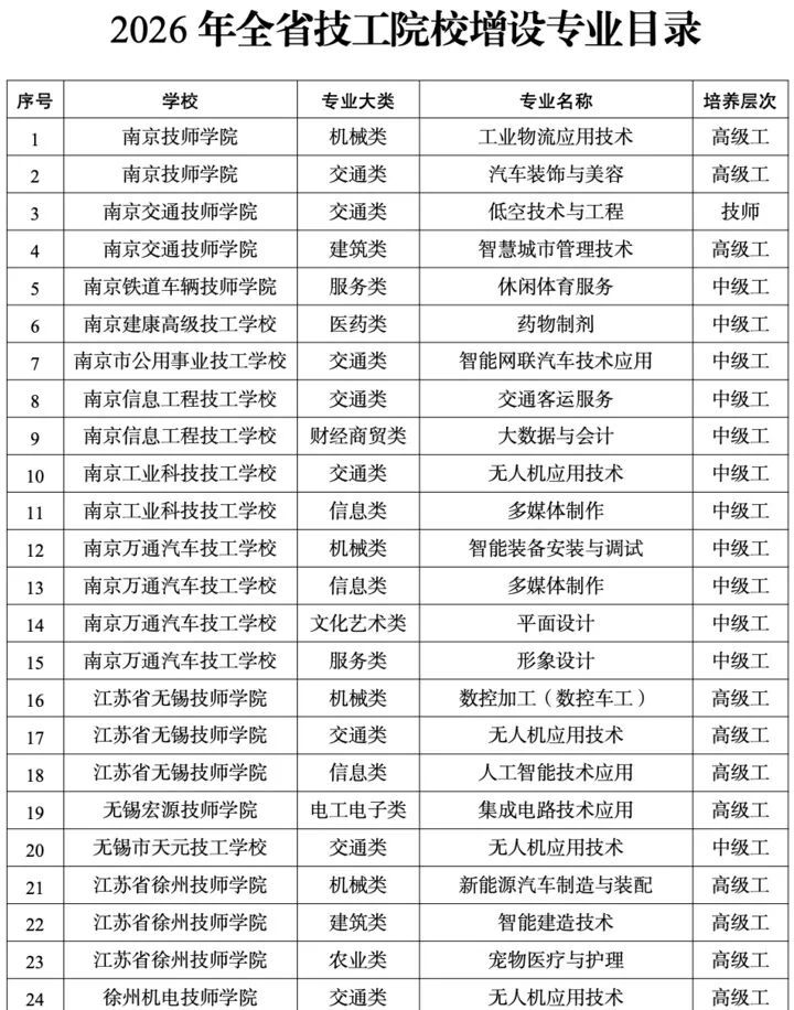 对于正站在升学路口的学生们来说,今年江苏技工院校的专业选择更加丰富了。随着公示期结束,全省64所技工院校共新增157个专业,为同学们带来了更多元的选择和更清晰的就业方向。