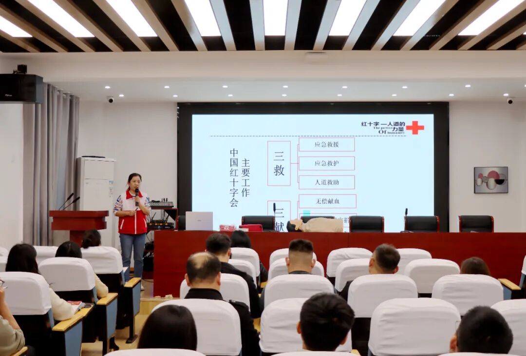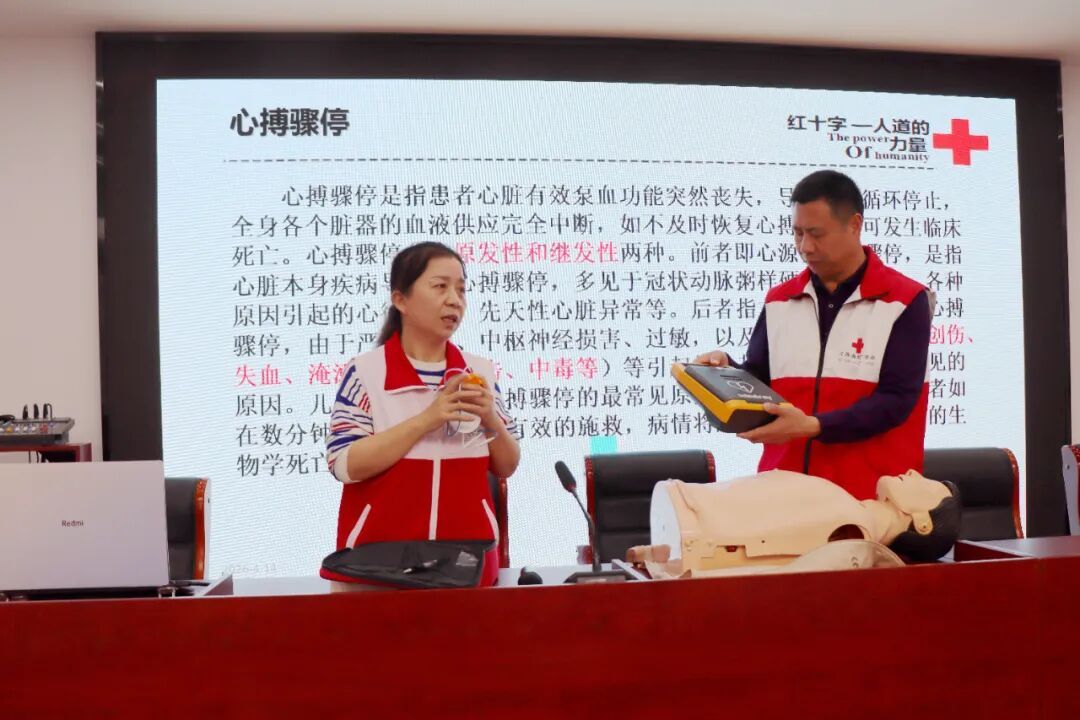 为进一步提升校园教职工应急救护能力,普及科学实用的急救知识,筑牢校园安全防护屏障,4月14日下午,涟水县红十字会应急救护培训团队在我校中正楼阶梯教室,为50名教职工开展专业的心肺复苏(CPR+AED)急救技能培训。