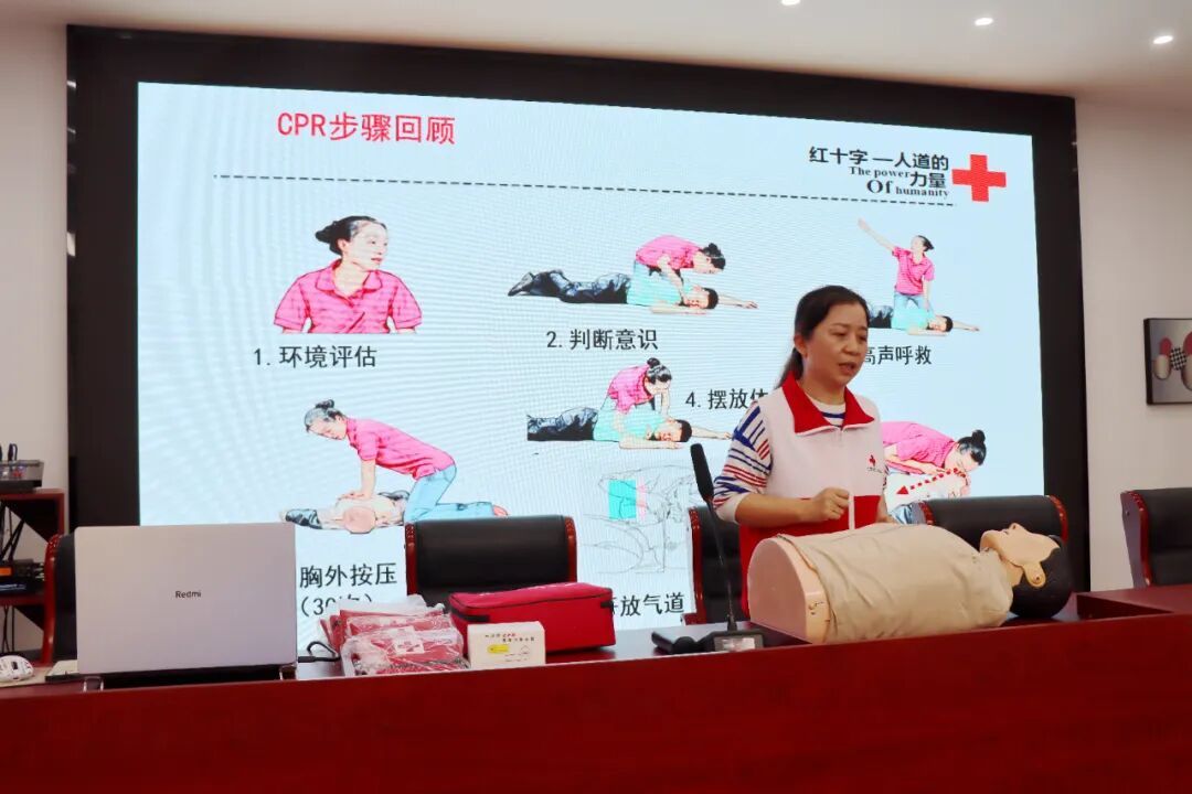 在示范教学环节,红十字会培训讲师借助专业模拟人,现场进行完整的心肺复苏操作示范,从判断现场环境、意识判断、呼救求援、胸外按压、清理口腔异物、开放气道、人工呼吸,到AED设备的规范使用、操作流程,每一个步骤、每一个动作要领都逐一演示、细致讲解。参训教师们认真观看、仔细聆听,全程专注学习标准操作流程,进一步加深了对急救技能的直观理解。