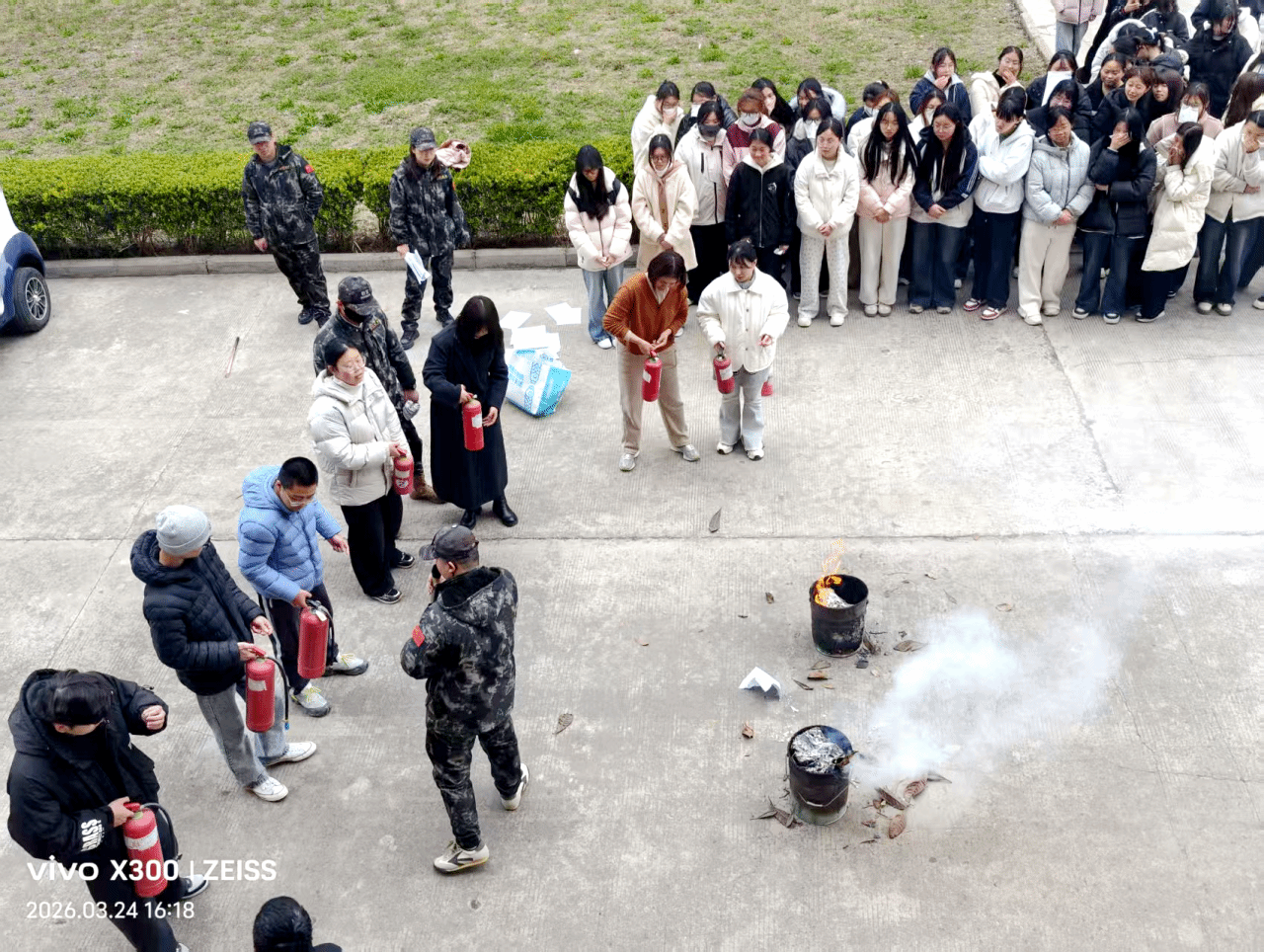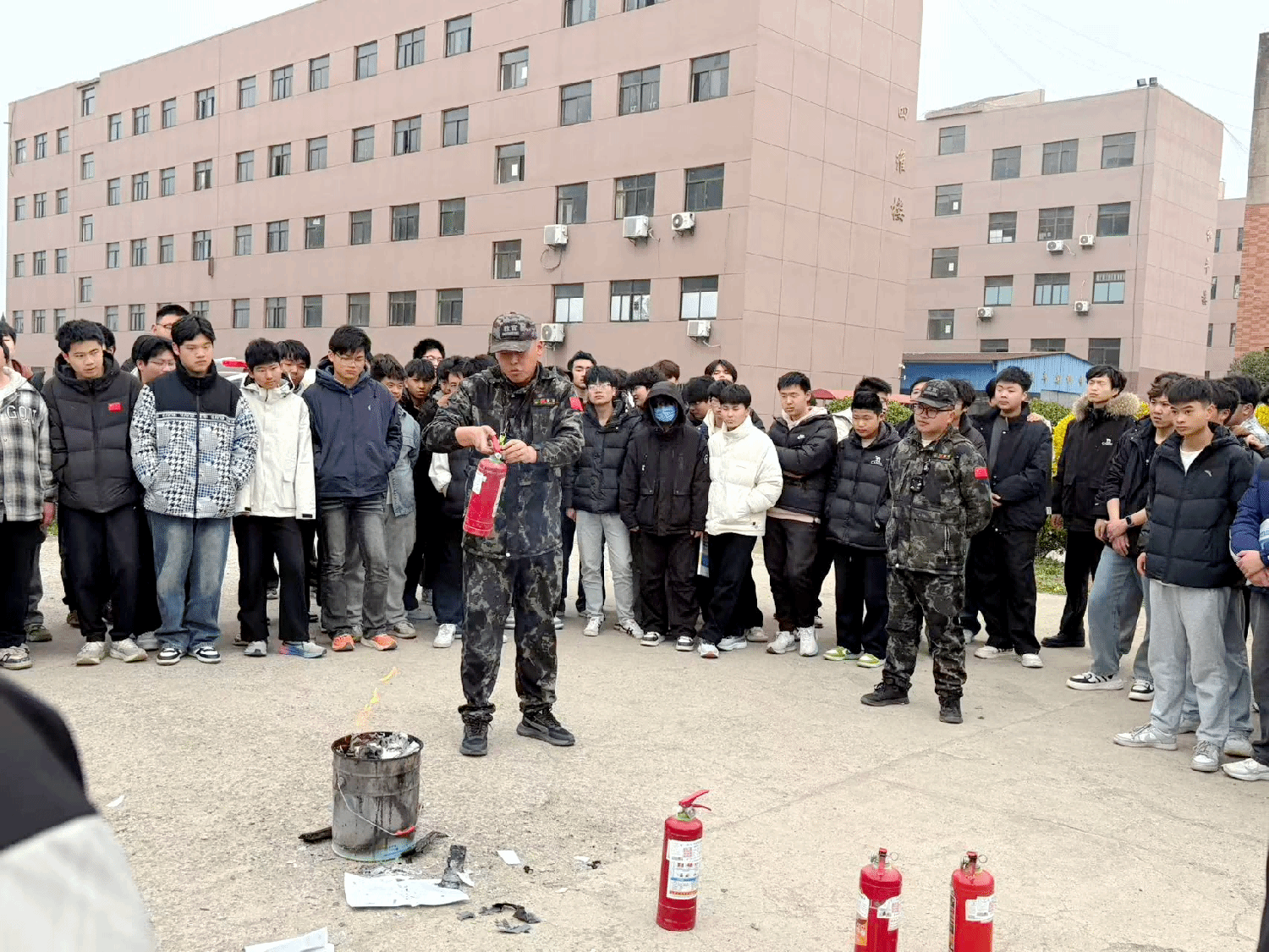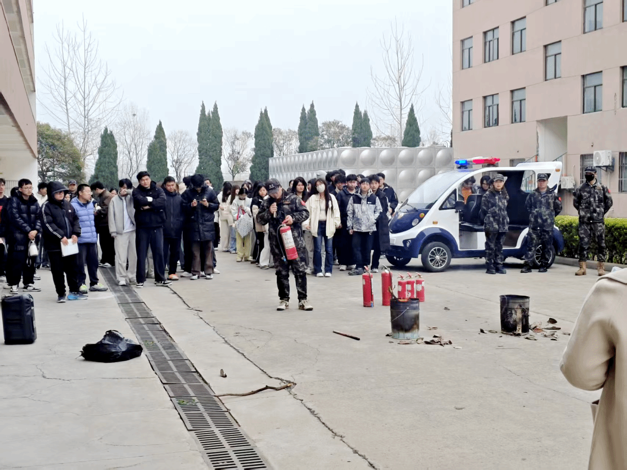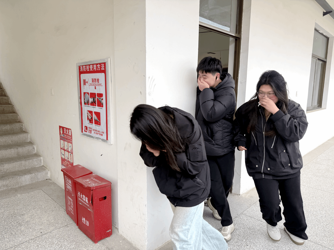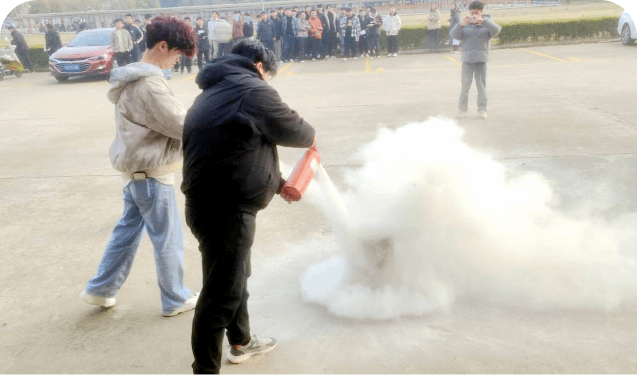 人员安全撤离后,消防指导人员现场开展实操教学,详细演示手提式灭火器、室内消火栓的操作流程与使用技巧,手把手指导参演人员进行灭火实操,让大家熟练掌握“提、拔、握、压”灭火器使用要领,以及消火栓连接、出水灭火的实操方法,切实将理论知识转化为实战能力,全面提升师生及教职工应对初期火灾的处置能力。