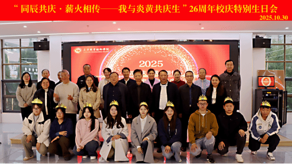 10月30日,是我校校庆日。当天下午在食堂二楼,校领导、在10月30日过生日的11名师生及坚守岗位26周年的教师欢聚一堂,共同庆祝炎黄26周岁生日。