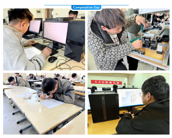 比赛过程中,各赛场秩序井然,参赛选手沉着应战、操作规范,充分展现了扎实的专业功底和良好的职业素养。在零部件测绘赛场,选手们精准测量、细致绘图;PLC编程赛场上,程序设计与调试紧张有序;CAD设计项目中,三维建模与工程图绘制精益求精;电气安装调试环节,线路布置与系统调试更是体现了选手们的综合实践能力。