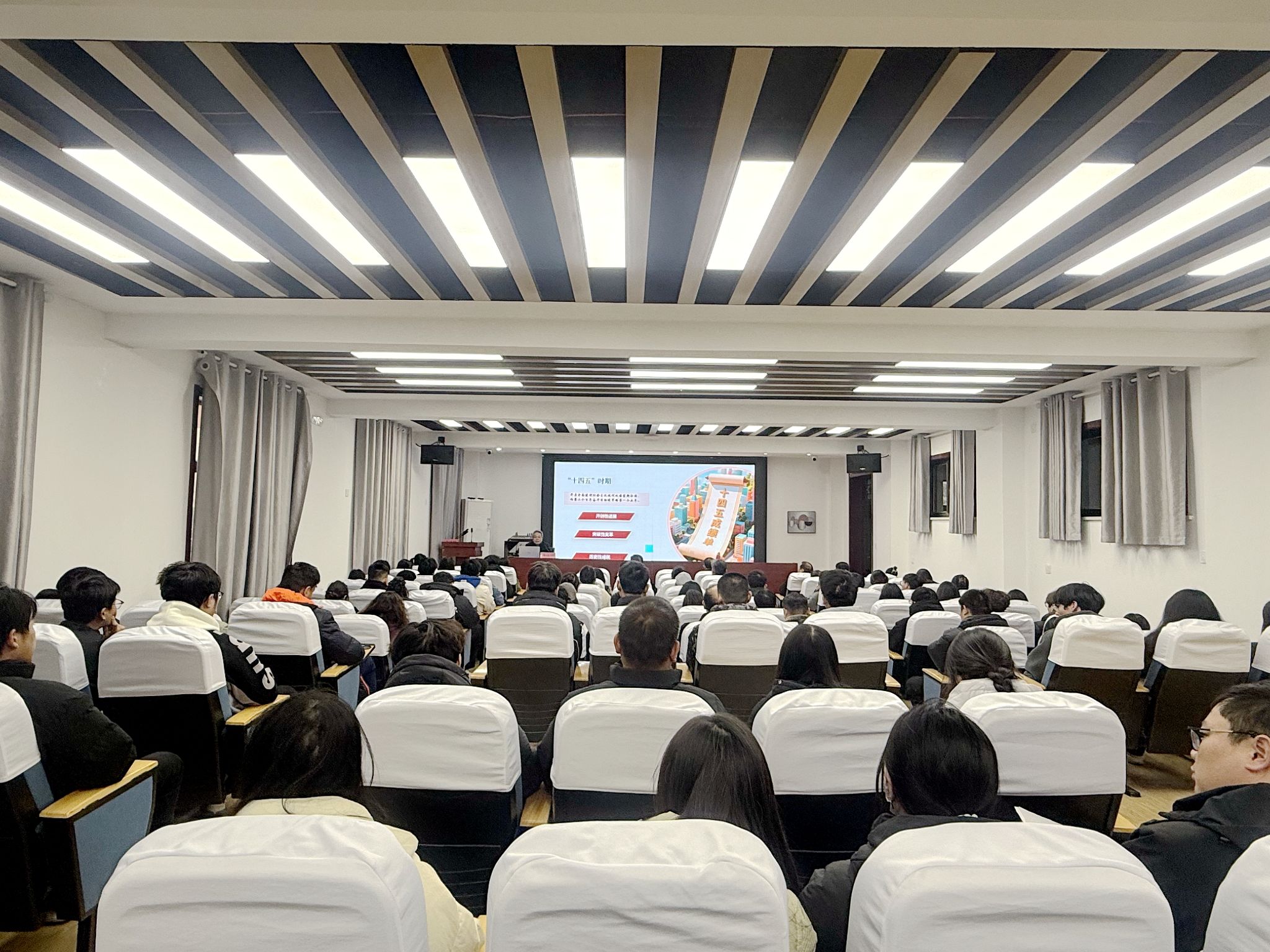 报告会上,杨满仁以《奋力开创中国式现代化建设新局面》为题,围绕习近平总书记在党的二十届四中全会上的重要讲话精神和全会《建议》,从重大成就、重大意义、形势判断、核心要义、贯彻落实五个维度对全会精神进行了系统阐释和深入解读。宣讲报告全面梳理了“十四五”时期我国经济社会发展的重大成就,深刻阐释了全会战略抉择的时代价值,围绕“十五五”时期我国发展环境基本特征进行了形势分析,深入解码了中国式现代化的“十五五”行动纲领。报告从历史与现实、理论与实践相结合的宏大视角,系统阐释了党的二十届四中全会的重大部署,既有理论层面的深刻剖析,又有实践层面的路径指引,还以学生们的身边事为引证,旁征博引、娓娓道来,高屋建瓴、内涵丰富、逻辑严谨、论述精辟,非常精彩。