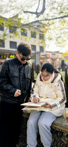 每日的作业批改环节成为研学的“二次课堂”。两位带队教师结合当日写生场景逐一点评:对构图失衡的作品,标注“可借鉴南湖‘左右对称、主次分明’的布局调整”;对色彩偏差的画稿,提示“参考查济白墙‘晨暖暮冷’的自然色调规律”。同学们拿着批改意见再赴实景比对,创作中的不足随之快速修正,专业技艺在理论与实践的联动中稳步提升。