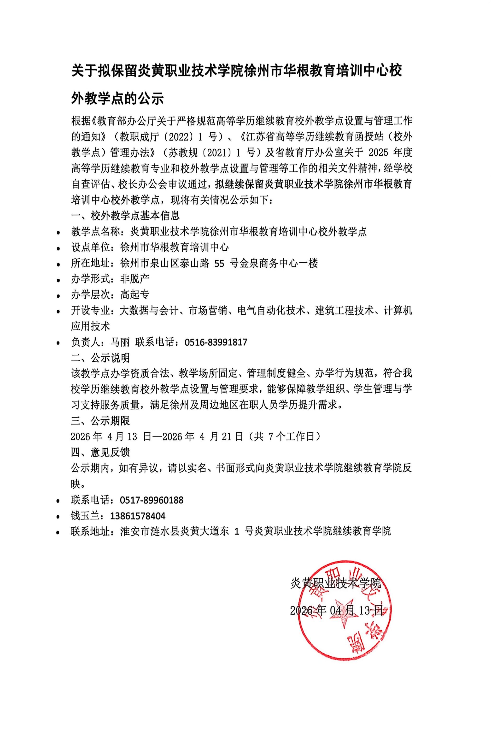 关于拟保留炎黄职业技术学院徐州市华根教育培训中心校外教学点的公示