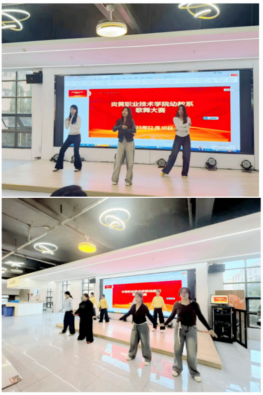 深秋初冬之际,校园里却洋溢着青春的热情。大赛吸引了幼教系各年级学生踊跃参与,参赛队伍围绕“冬之韵”主题,精心编排了形式多样、富有创意的歌舞节目。舞蹈类节目既有展现冬日静谧与诗意的现代舞,也有活泼欢快、充满活力的舞蹈创编;声乐表演则涵盖了校园民谣及积极向上的流行歌曲,同学们用动人的歌喉与真挚的情感,展现出幼儿教育专业学生良好的音乐素养与舞台表现力。