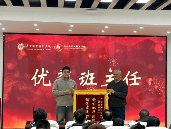 优秀班主任代表史海静、李志远依次上台,分享班级管理中的实践经验与育人智慧,干货满满、启迪人心。会议同时表扬了辅导员解秀成的暖心事迹。他耐心化解汽修专业323汽修2班两名学生的矛盾,赢得家长通过12345工单致谢,邱芳贤处长代表学生家长,为解老师送上表彰锦旗,彰显学工队伍“以生为本、以爱育人”的初心。