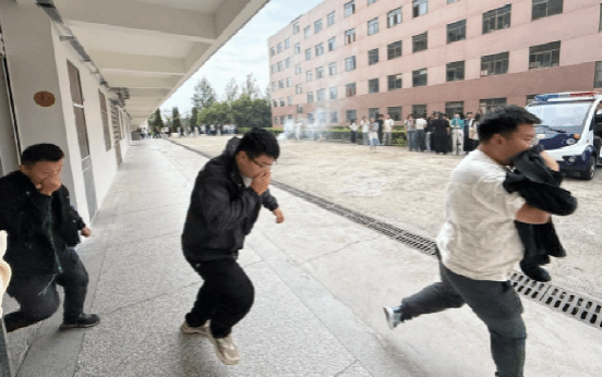 随后,4:15分,开展消防应急演练,长鸣 30 秒的警报信号划破校园宁静,消防演练正式启动。在画室作画、教室上课的师生迅速响应,在教官与任课教师的引导下,立即采取 “双手捂口鼻、低头弯腰姿” 的规范逃生姿势,沿墙壁快速向疏散通道移动。孙俊菊主任全程巡查监控现场,及时疏导可能出现的恐慌情绪,保障疏散秩序。警报声2分钟后,即4:17时许,最后一批师生安全抵达教学楼前广场集结点,各班主任迅速清点人数并汇报。