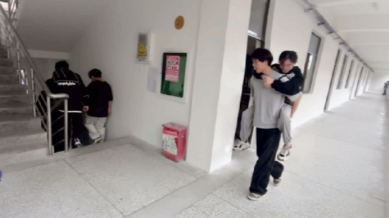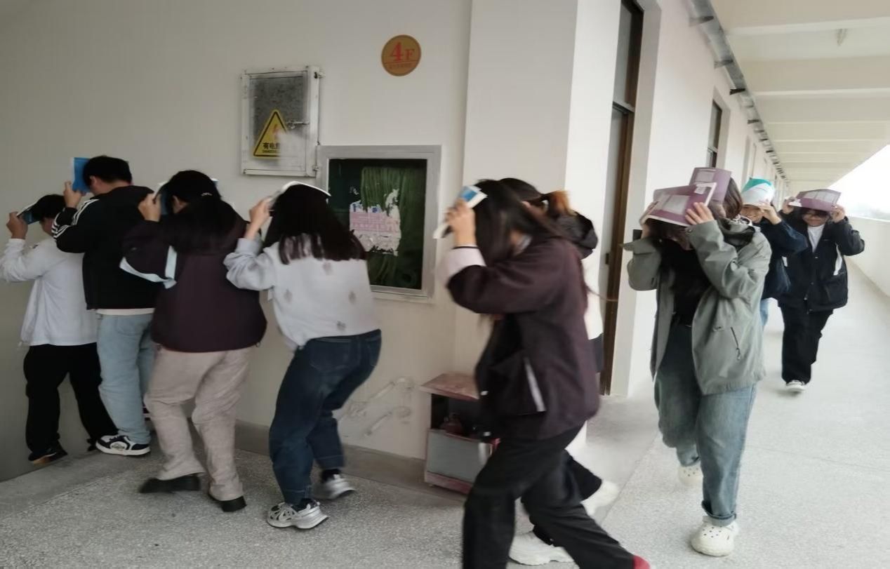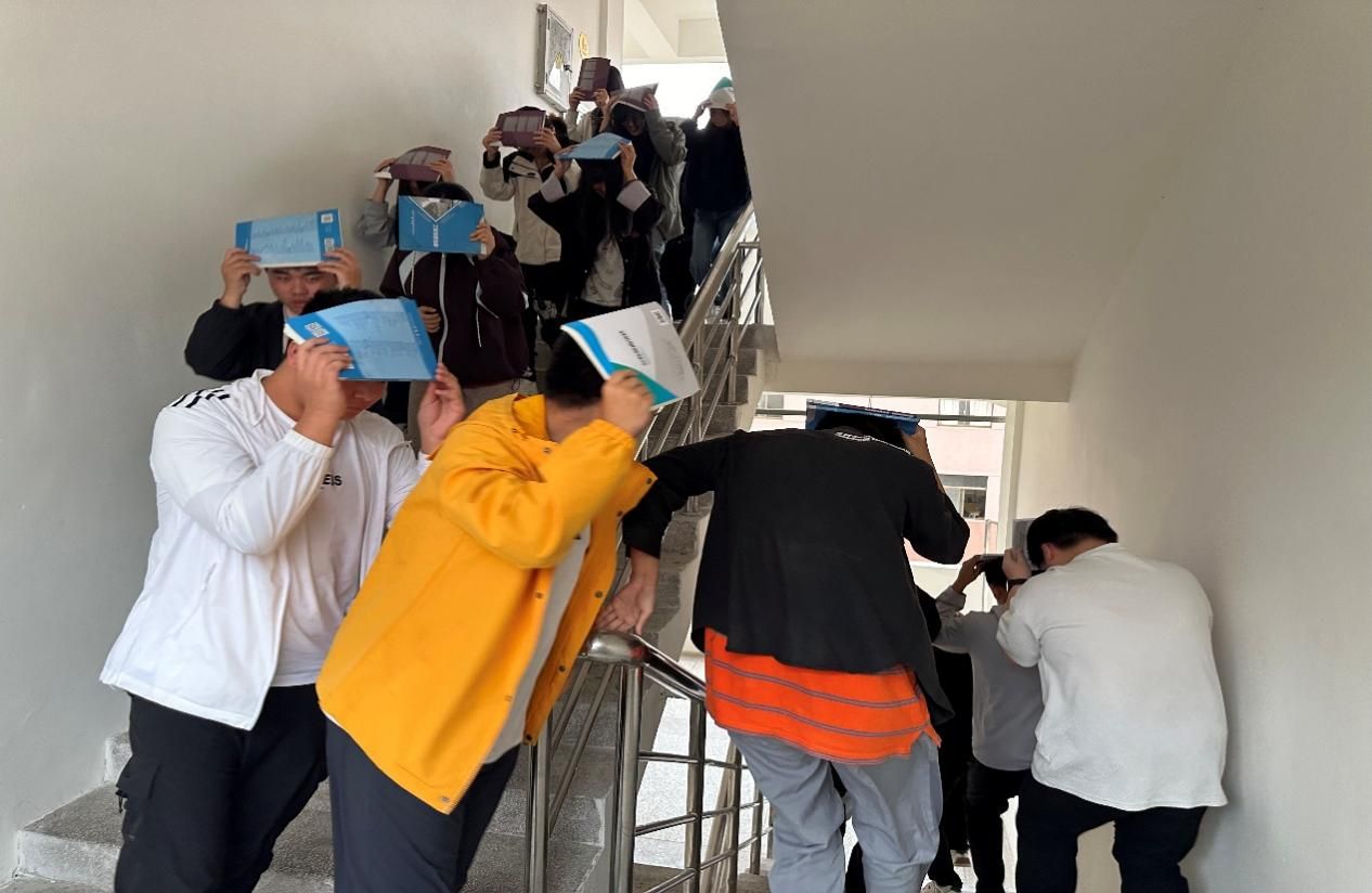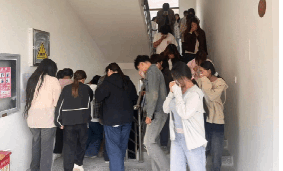 下午4:00,首先开展防震演练,演练环节,听到警报声后立即采取 “双手抱头、屈膝伏地、躲于桌下” 的规范避险姿势,双手紧抓桌腿降低重心,避免身体暴露于空旷区域。赵鹏助理全程往返各教室巡查督导,轻声提醒师生保持镇定,纠正不规范避险动作。警报声 1 分 30 秒后,即 4:01 时许,疏散指令下达,师生沿 “先内后外、先低后高” 顺序,弯腰扶墙快速向楼外空旷地带转移,各班主任在班级队伍末端断后,确保无人滞留。4:03 时许,最后一批师生安全抵达操场集结点,各班主任迅速清点人数并向现场指挥组汇报。