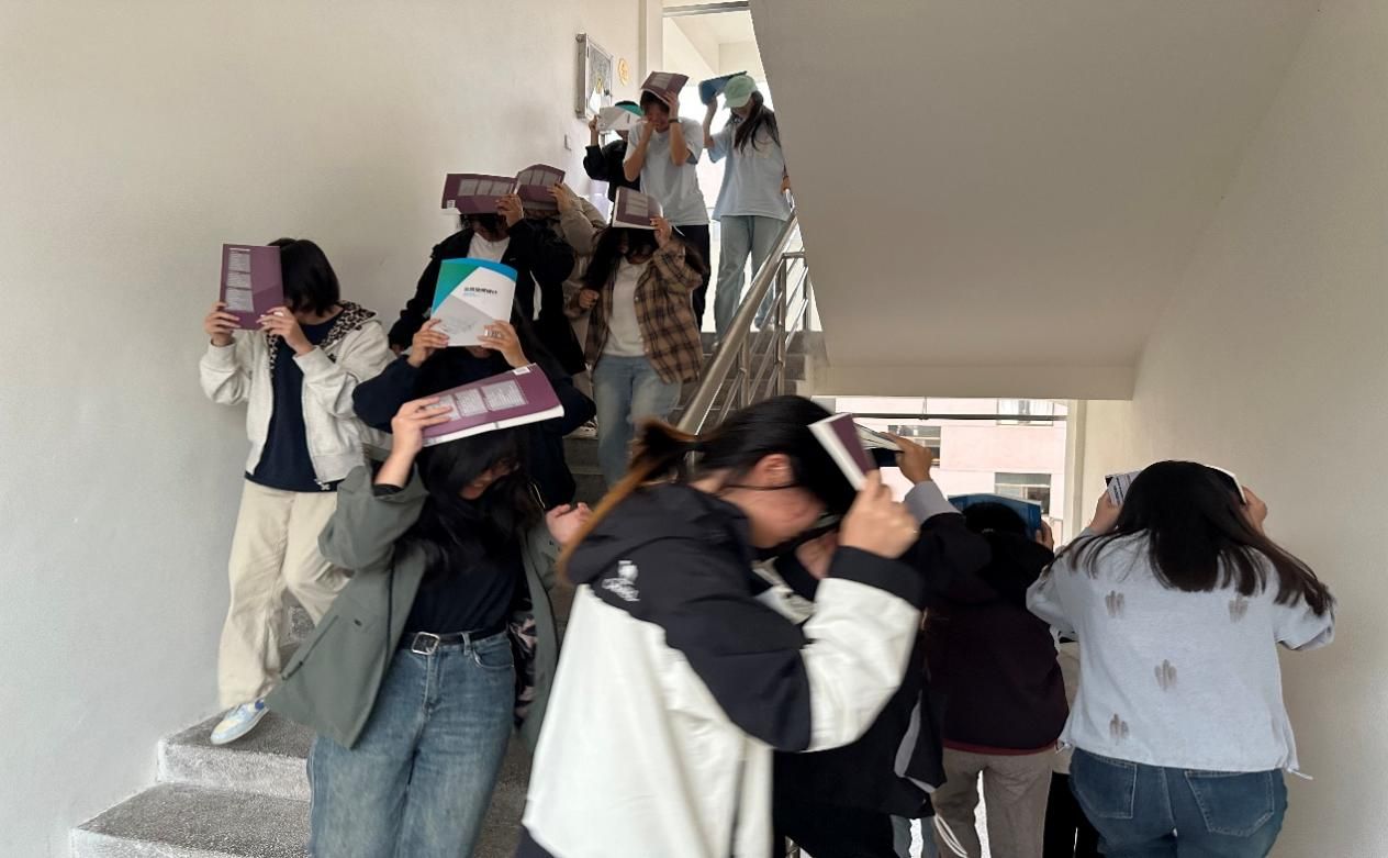 结合设计系教学楼布局、师生分布及专业教学场景,系部专门规划 2 条疏散主通道,在楼梯转角、走廊岔口等关键位置设置醒目标识,明确“先低层后高层、分批次不推挤”的疏散原则。同时,主动对接校保卫处、德育处及教官团队,厘清各方职责边界,构建 “系部统筹、教官指导、全员参与” 的联动工作格局,做好身体伤、病、弱等特殊群体策略,为演练顺利开展筑牢基础。